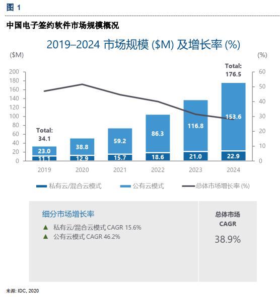 当前,提供标准化的公有云软件即服务(SaaS)是中国电子签约产品的主要部署模式。由于疫情给线下产品的实施和交付带来了阻碍,2020年私有云或混合云部署模式的电子签约产品增速将放缓。预计2024年,中国电子签约软件市场的总体规模将达到1.8亿美元,5年复合增长率为38.9%。