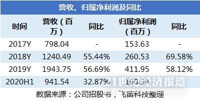 据贝泰妮招股书披露的最新数据,2020年上半年,公司实现营业收入9.41亿元,同比增长32.87%,归属净利润为1.6亿元(由于招股书未披露2019年上半年数据,因此不能得知归属净利润同比增速)。从往年的数据看,2019年,公司实现营业收入19.43亿元,同比增长56.69%,归属净利润为4.12亿元,同比增长58.12%,公司业绩维持高增长。