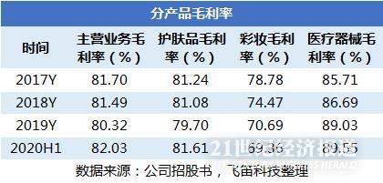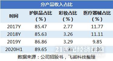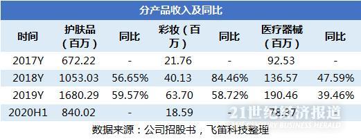 2019年,公司的护肤品实现收入16.8亿元,同比增长59.57%,对比2018年56.65%的同比增速,2019年护肤品的收入继续维持高增长;同期,彩妆实现收入6370万元,同比增长58.72%,较2018年增速下滑;医疗器械实现收入1.9亿元,同比增长39.46%,较2018年同样出现增速下降。