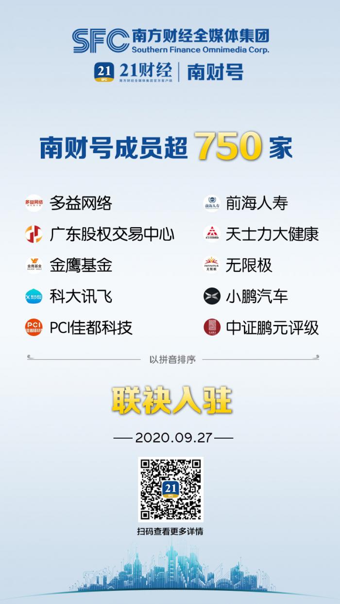 在9月27日举行的“2020中国智造业年会”现场,又有一批知名企业及金融机构集体入驻南方财经全媒体集团“南财号”平台,它们是(排名不分先后):多益网络、广东股权交易中心、金鹰基金、科大讯飞、PCI佳都科技、前海人寿、天士力大健康、无限极、小鹏汽车、中证鹏元评级。截至目前,南财号平台入驻成员已超过750家。详情>>
