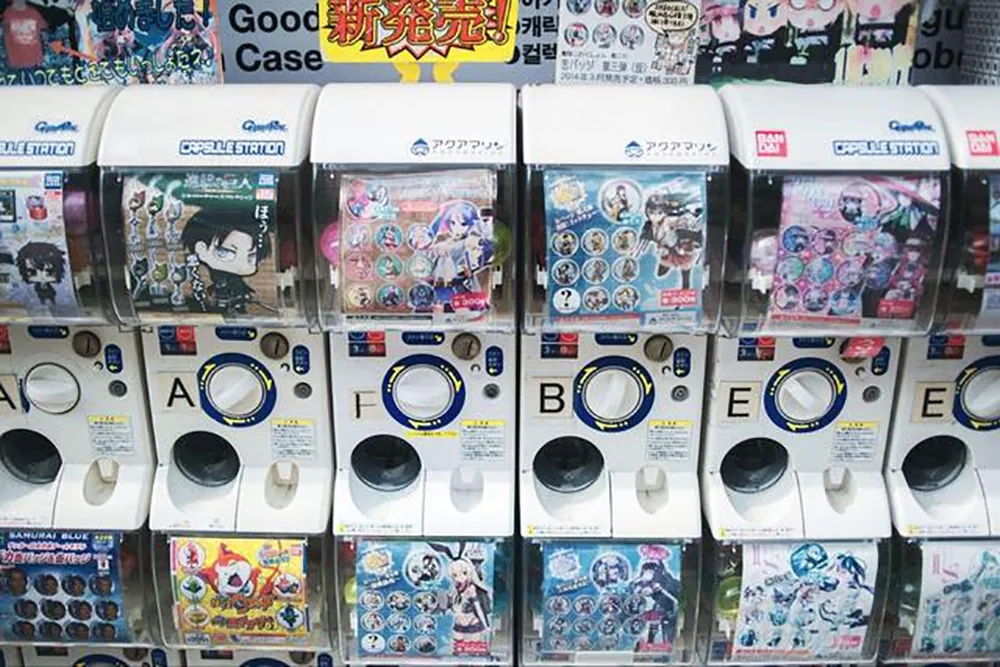 扭蛋里的玩具,需要打开扭蛋后才能知晓。如今,这类投入硬币就会滚出装有玩具的扭蛋的机器,仍可以在日本药妆店、便利店等处见到。