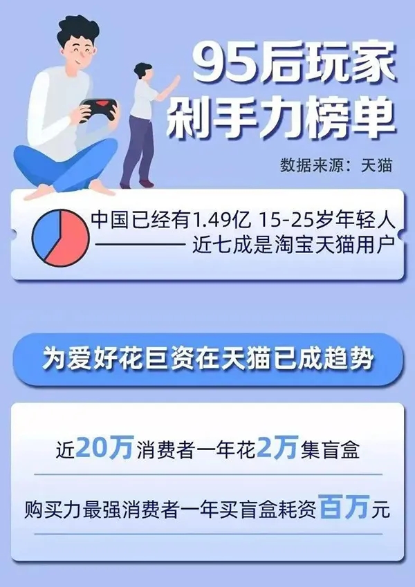 中国产业信息网数据显示,2019年盲盒玩具增速达609%,消费者人均购买4.2个。天猫发布的《95后玩家剁手力榜单》中显示,天猫上一年有近20万“硬核玩家”在盲盒上年花费超过2万元。