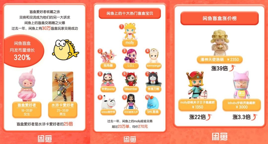 与玩具生产商一起被盲盒带火的还有二手交易平台,一些经典、限量款玩偶大量涌入二手交易市场,价格暴涨几倍甚至十几倍。