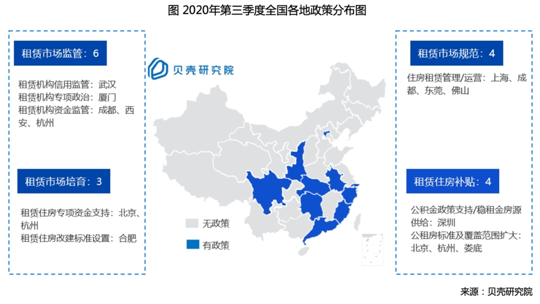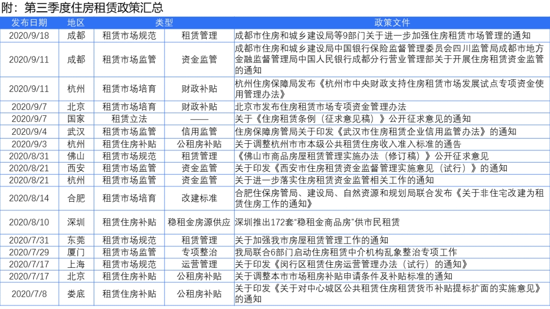 第三季度住房租赁政策以“强监管、促供给、稳租金、去杠杆”为核心。2020年第三季度,全国12个地区发布了17项租赁相关政策,以规范和培育租赁市场。租赁市场监管层面,6个地区重点完善了对机构的资金和信用的监管。租赁市场规范层面,4个地区明确提出市场主体登记、租赁合同网签备案、资金监管等方面的规范要求。租赁市场培育层面,3个地区规定了机构专项资金支持、存量房改建租赁房屋的标准。租赁住房补贴层面,4个地区明确了为个人提供公积金政策支持、稳租金房源,并扩大公租房覆盖范围。