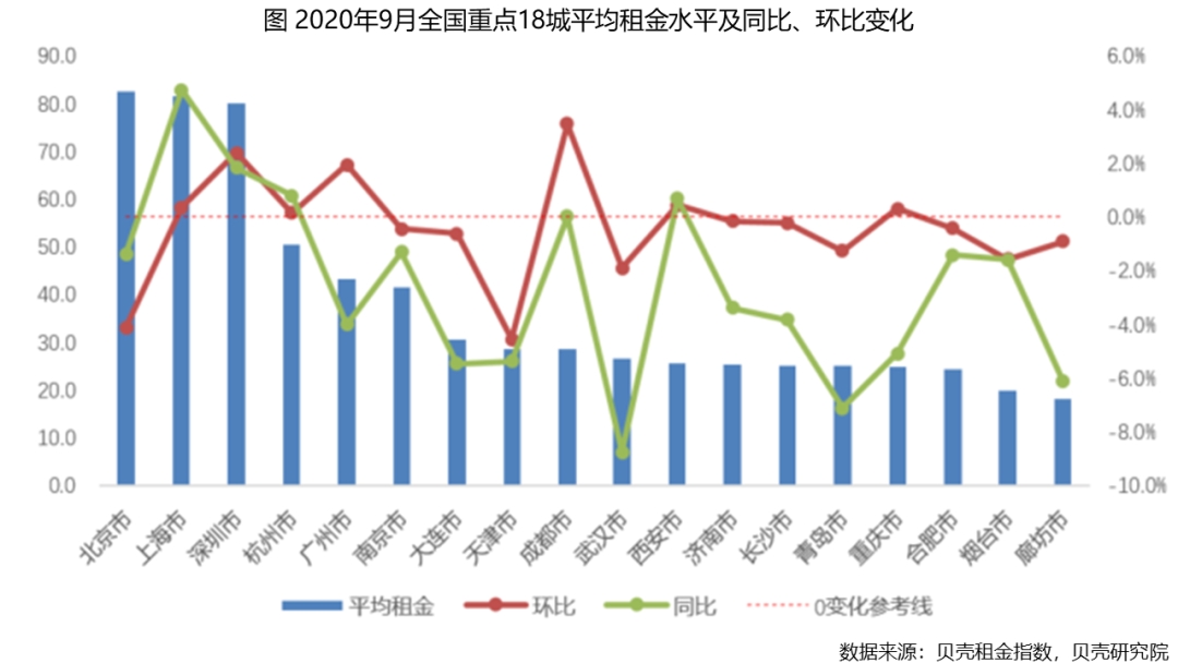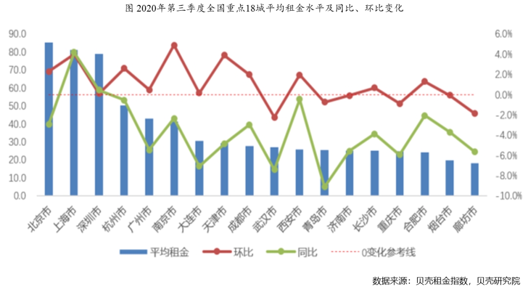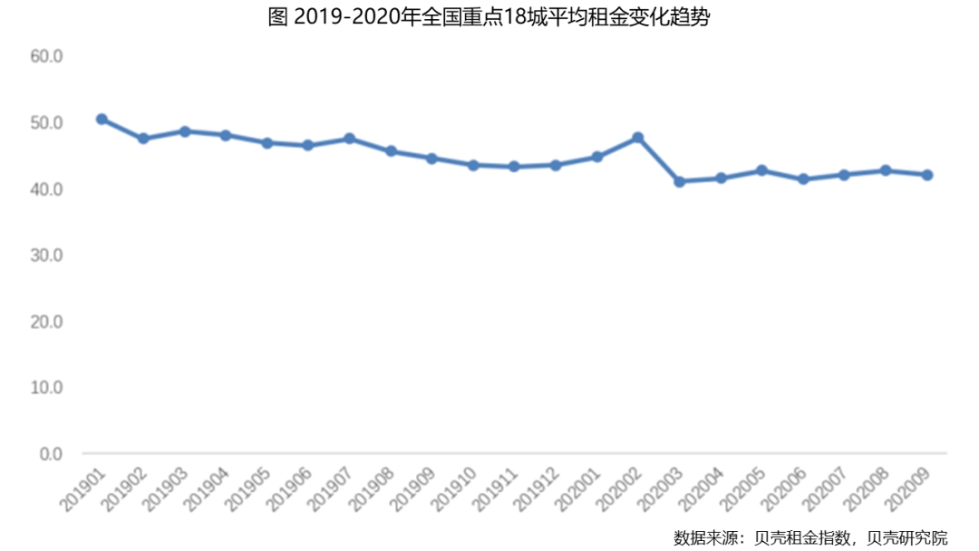 第三季度全国重点十八城平均租金水平环比稳中微涨,同比下降7.9%。根据贝壳研究院数据,2020年第三季度全国重点十八城平均月租金为42.4元/平方米,环比第二季度上涨1.0%,同比去年第三季度下降7.9%。全国重点十八城的平均租金3月下降14.0%,4-9月环比变动幅度在4%以内,维持在低位水平。