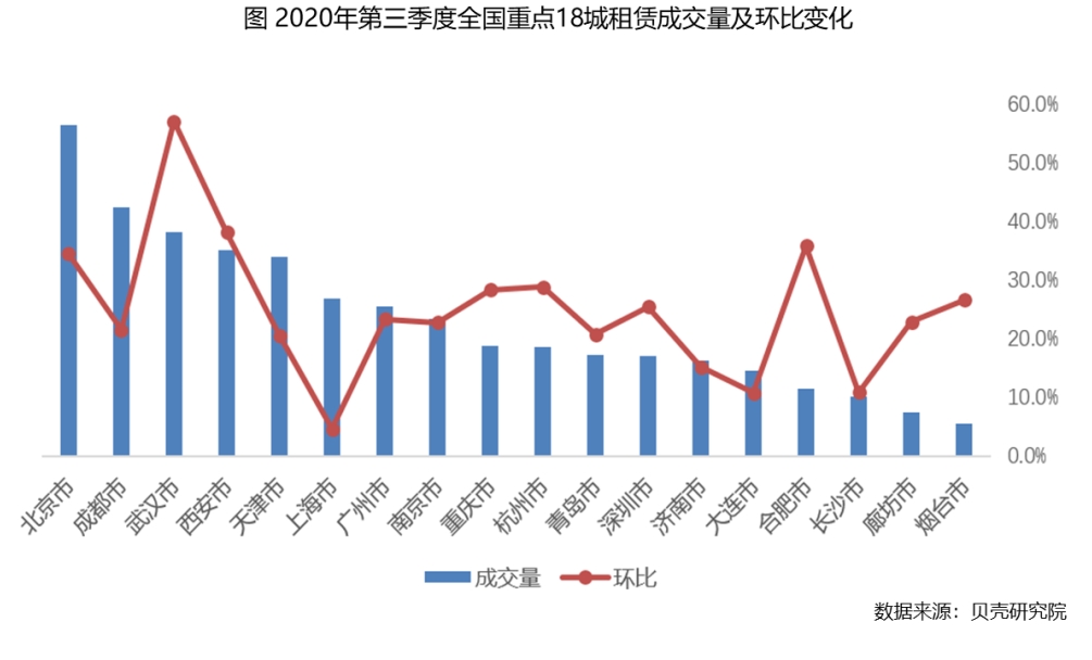 第三季度各城市租赁成交量回升,多数城市成交量环比涨幅超20%。根据贝壳研究院数据,2020年第三季度全国重点十八城成交量均环比上涨,其中,北京、成都、武汉、西安、天津、广州、南京、重庆、杭州、青岛、深圳、合肥、廊坊和烟台市10个城市涨幅超20%,其中武汉成交量环比涨幅最高,超50%。随着疫情防控的好转,第三季度各城市租赁活跃度有所回升。