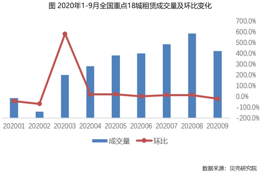 第三季度租赁市场成交缓慢修复,成交量达到年内峰值。根据贝壳研究院的数据,2020年第三季度全国重点十八城[1]租赁成交量环比第二季度上涨26.0%,租赁成交量在8月达到峰值。由于受到疫情冲击,租赁成交量在2月触底,随着疫情的好转,3、4、5月租赁需求持续释放成交量持续上涨,虽然在6、7月北京、大连等地疫情二次反弹,但整体市场仍保持上扬的态势。第三季度,毕业旺季的租赁需求释放,7、8月成交量连续上涨并达到峰值,9月则开始转入传统淡季,成交量下降。今年第三季度市场表现基本符合往年的租赁市场规律,租赁市场持续得逐渐修复,回归常态化轨道。