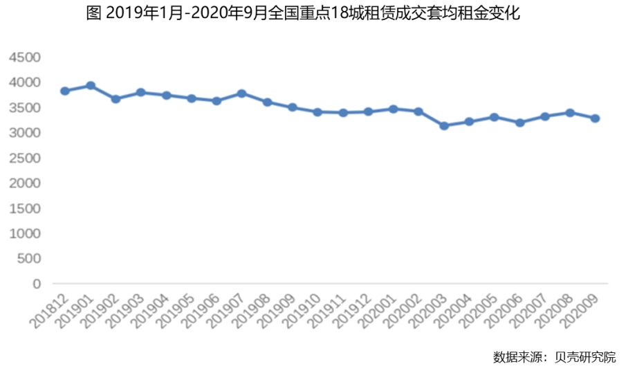 套均租金水平环比回升,同比下降。根据贝壳研究院的数据,2020年第三季度全国重点十八城平均每月租金为3344.8元/套,环比上涨3.2%,同比下降8.0%。三季度租客支出的套均租金水平有所回升,仍低于去年同期水平。