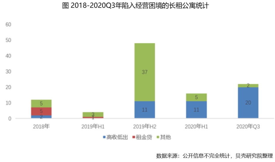 第三季度长租公寓企业集中“爆雷”,超过20家企业面临经营纠纷、资金链断裂或倒闭。据不完全统计信息,仅8月、9月连续有22家中小长租公寓企业陷入纠纷、资金链断裂或倒闭,这些企业中超九成采用的是“高收低出”的经营模式,且多为分散式的中小长租公寓。企业以高价从各业主方获得房源,再以低于市场的价格出租给租客。今年由于受到疫情的冲击,租赁市场低温运行,长租公寓企业出租率下降,空置率上升,企业现金流普遍吃紧。“高收低出”经营模式的中小企业则首当其冲,公寓出租困难导致难以获得可持续的现金流,因而纷纷陷入经营困境。