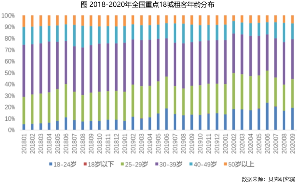租客群体呈现年轻化趋势,18-24岁租客占比同比去年增加了5.3个百分点。根据贝壳研究院数据,2020年第三季度全国重点十八城18-24岁租客占比18.7%,同比增加了5.3个百分点,相比于2018年第三季度增加了10.6个百分点,30岁及以上的租客同比均逐步减少。95后、00后逐渐进入租赁市场,品质租赁需求增加。
