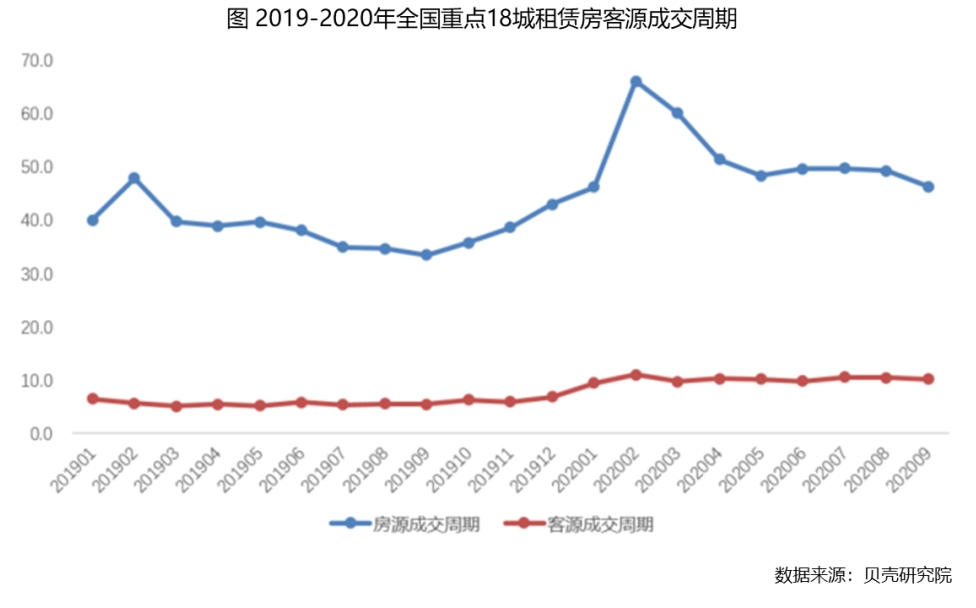 第三季度租客议价能力提升,客源成交周期同比延长了5天。根据贝壳研究院数据,2020年第三季度全国重点十八城房源成交周期48.8天,客源成交周期10.4天。第三季度房源成交周期环比缩短了0.9天,同比延长了14.4天,客源成交周期环比延长了0.3天,同比延长了5天。房客源成交周期自2月达到高位后,一直维持在高位水平,9月房客源成交周期分别为46.4和10.2天,环比分别缩短了3天和0.3天,同比分别延长了12.9天和4.8天。第三季度房客源成交周期仍保持高位,房源成交周期有所下降,业主出租房屋迫切度提高,而客源成交周期同比和环比均在延长,同比延长了超90%,租客方成交时间延长,议价能力提升。