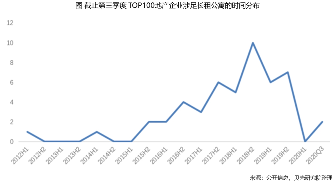 第三季度房企对长租公寓的热情减退,TOP100房企中仅2家新开拓长租公寓业务。依据贝壳研究院统计,2020年第三季度仅有2家房企开拓长租公寓业务,其余房企对长租公寓业务不再热衷。截止目前,TOP100房企中已有近五成涉足长租公寓,其中2017到2019年涉足长租公寓业务的房企占比超过75%。随着地产行业发展,房企开始转变“开发-销售”的传统模式,纷纷拓展长租公寓业务,以寻找新的业务增长点。从现有的公开信息来看,仅有2家房企在2019年上半年将长租公寓业务出售或剥离至集团,其余大部分房企发展长租公寓业务的时间为1-3年,未来发展面临转型或精耕的选择。