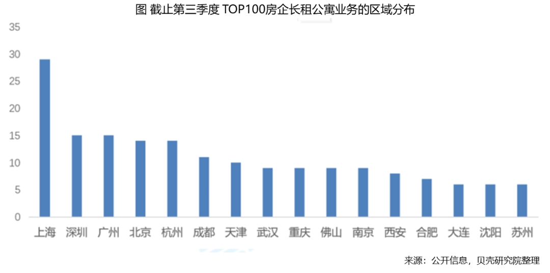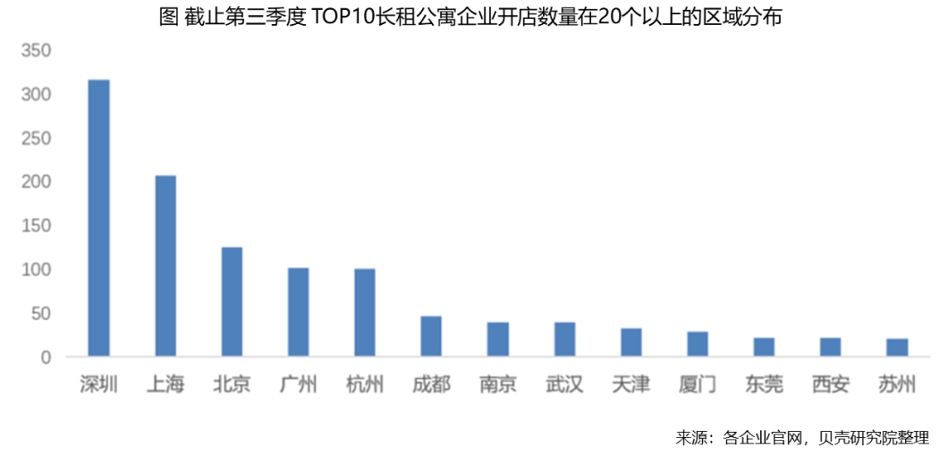 城市选择较为集中,北上广深杭为房企长租公寓布局战略高地。根据不完全统计,截止第三季度,TOP100房企的长租公寓业务和TOP10长租公寓品牌入驻最多的城市均为北上广深杭,业务布局较为集中。TOP100房企的长租公寓业务主要分布在北上广深一线城市和大部分新一线城市,房企布局最多的城市为北上广深杭。新一线城市中,除青岛、郑州和东莞外,其余城市布局长租公寓业务的TOP100房企均超过五个。同时,根据贝壳研究院对TOP10长租公寓品牌的监测,其门店数量最多的前五个城市也为北上广深杭,在北京、上海、深圳等13个城市的数量占TOP10门店总数的近85%。