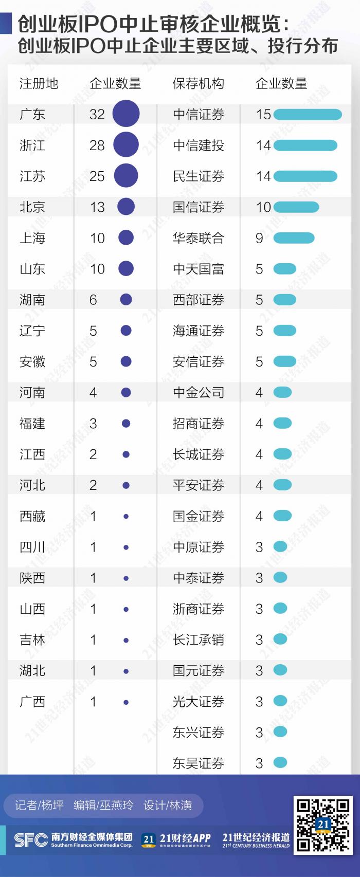 从保荐机构来看,合计有43家机构的项目出现中止审核情况,其中中信证券作为投行业务最为强劲的大机构之一,目前包揽了32家企业的创业板IPO项目,但其中有15家企业中止审核;紧随其后的中信建投、民生证券则各有14个申报项目申请中止。