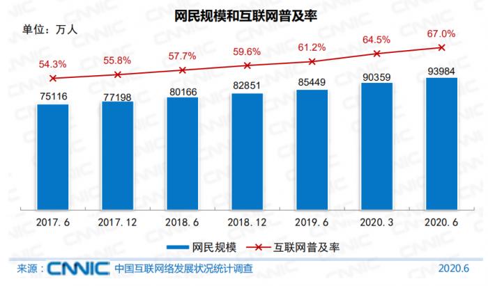 9月29日,中国互联网络信息中心(CNNIC)在京发布第46次《中国互联网络发展状况统计报告》(以下简称《报告》)。《报告》显示,截至2020年6月,我国网民规模达9.40亿,较2020年3月增长3625万,互联网普及率达67.0%,较2020年3月提升2.5个百分点。其中,农村网民规模为2.85亿,占网民整体的30.4%。