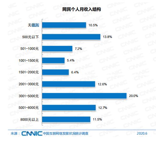此外,我国月收入在2001-5000元的网民群体占比为32.6%;月收入在5000元以上的网民群体占比为24.2%;有收入但月收入在1000元及以下的网民群体占比为21.0%。