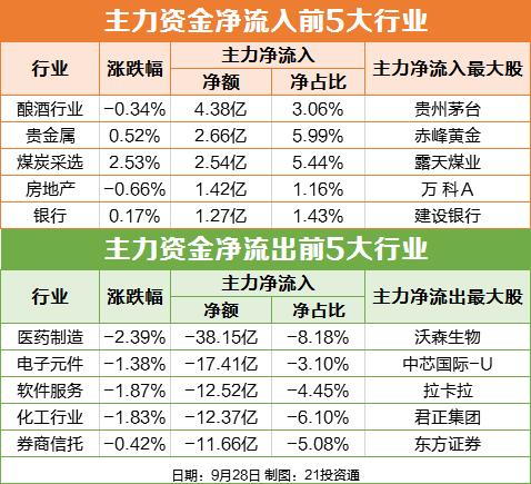 9月28日,A股三大股指集体收跌,个股普跌,两市成交额不足5500亿元,市场情绪持续低迷。盘面上,煤炭采选、白酒、HIT电池、民航机场、贵金属等板块领涨;纺织服饰、船舶制造、医药制造、数字货币等板块领跌。