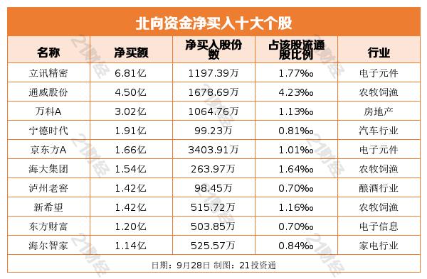 个股方面,北向资金净买入最多的是立讯精密(002475.SZ)、通威股份(600438.SH)、万科A(000002.SZ),分别为6.81亿元、4.50亿元、3.02亿元。