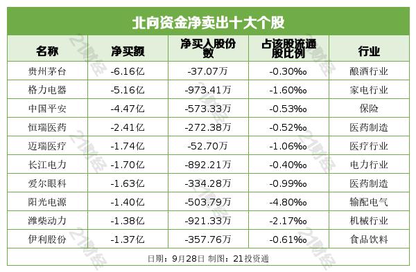 9月28日,北向资金净卖出10.79亿元,其中沪股通净卖出11.17亿元,深股通净买入0.38亿元。
