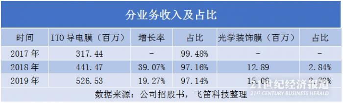 ITO导电膜主要用于智能手机、平板电脑等消费电子的触摸屏,公司的主要产品为150Ω方阻 ITO 导电膜。报告期内,公司ITO导电膜的收入分别为3.17亿元、4.41亿元和5.27亿元,2018年和2019年,公司ITO导电膜的收入增速分别为39.07%和19.27%,2019年增速下滑,与公司营业收入的增速变动一致,主要是因为ITO 导电膜产品价格在报告期内呈下降趋势。ITO导电膜收入占主营业务收入的比重分别为99.48%、97.16%和97.14%,公司存在产品结构较为单一的风险。