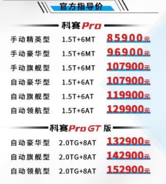 动力方面,科赛Pro搭载的蓝鲸1.5T发动机,匹配爱信6AT变速箱组,最高功率131kW,峰值扭矩265N·m,综合油耗为7.8升/100公里;科赛Pro GT版搭载的蓝鲸2.0T发动机,匹配爱信8AT变速箱,最大功率171kW,峰值扭矩360N·m。