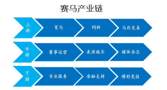 赛马行业产业链涉及广泛,上中下游辐射种马培育、赛事运营、金融支持、马彩竞猜等多个行业,全球赛马行业规模超万亿人民币。