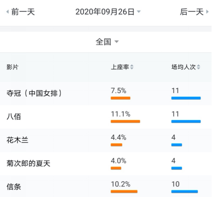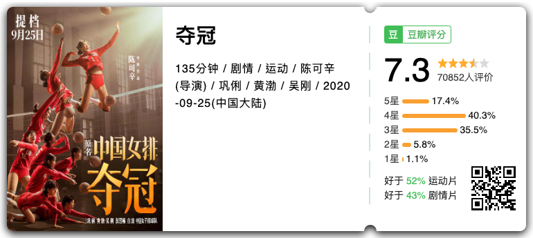 9月25日上映的《夺冠》,上映第二天上座率就被《八佰》反超。首周票房1.69亿,豆瓣7.3,无论票房还是口碑都有些差强人意。