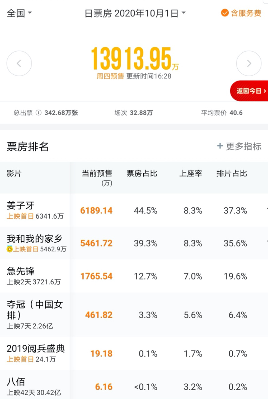 在10月1日当天的排片中,《姜子牙》为37.6%,《我和我的家乡》为35.8%,9月30日上映的《急先锋》从首日的49.6%降为19.6%,三部影片的排片占据总量的92.5%。