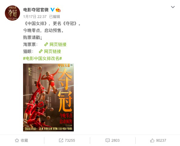 在原定的春节档之前,《中国女排》就已正式更名为《夺冠》。但显然影片不仅是改名那么简单:最终问世的影片从内容结构到片名都做了新的调整,从成片来看,删除了关于陈忠和的大量戏份。