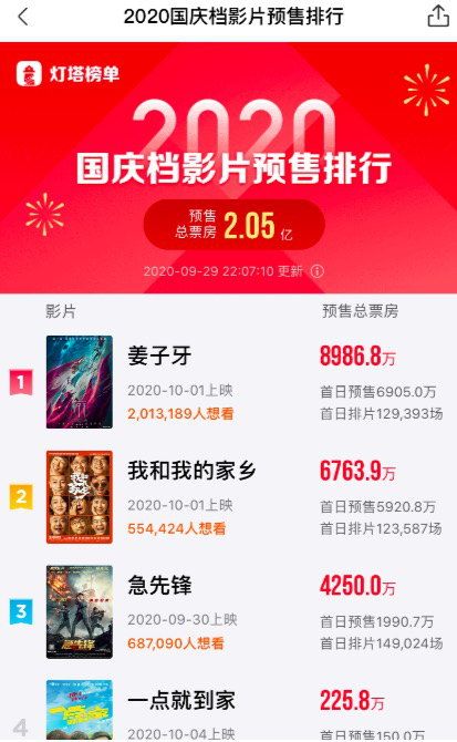 根据灯塔数据显示,截至9月29日晚,国庆档预售总票房突破2亿元,其中前三的《姜子牙》《我和我的家乡》以及《急先锋》分别为8900万、6700万和4200万,占国庆档预售票房的95%以上。