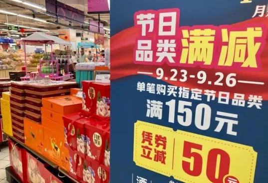 该负责人还表示,除了月饼,其他礼盒类产品,比如牛奶、酒水等,销量基本都不如以往,去年有18个地堆卖各种礼盒,今年只布置了15个,另外几个放一些普通包装的促销产品。