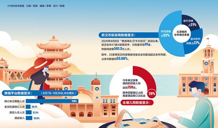 武汉市旅游局提供的数据显示,2020年8月8日“惠游湖北 打卡大武汉”启动以来,武汉全市A级景区47家中,已恢复开放41家,共接待游客561.3万人次。其中,22家景区日均游客接待量完全恢复或超过去年同期,占全市数量的53.66%。从游客的分布情况来看,省外游客占21%,省内市外游客占27%,市内游客占52%。