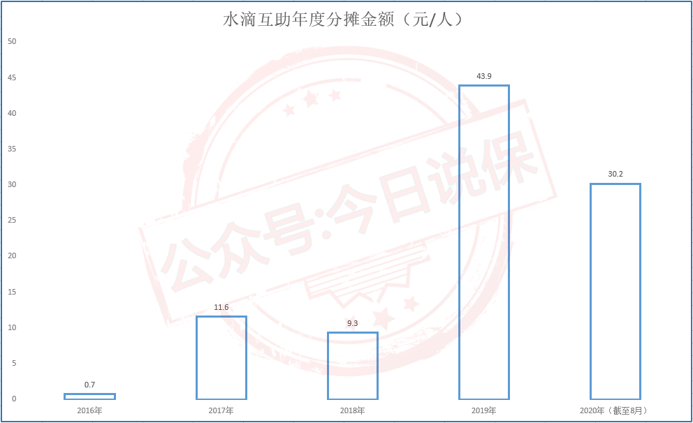 成立四年以来,水滴互助在2019年分摊金额激增,从2018年人均9.3元的分摊费用上涨至43.9元。
