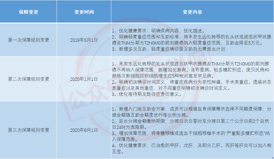 先是将轻症甲状腺癌和轻症前列腺癌最高赔付金由10万降至5万,之后又将这两种疾病移出赔付范围,再是新增入门版互助计划,将互助金标准下降为1/3或1/2,目的都是为了降低用户分摊金额,以期维持用户基数,降低用户退出互助计划风险。