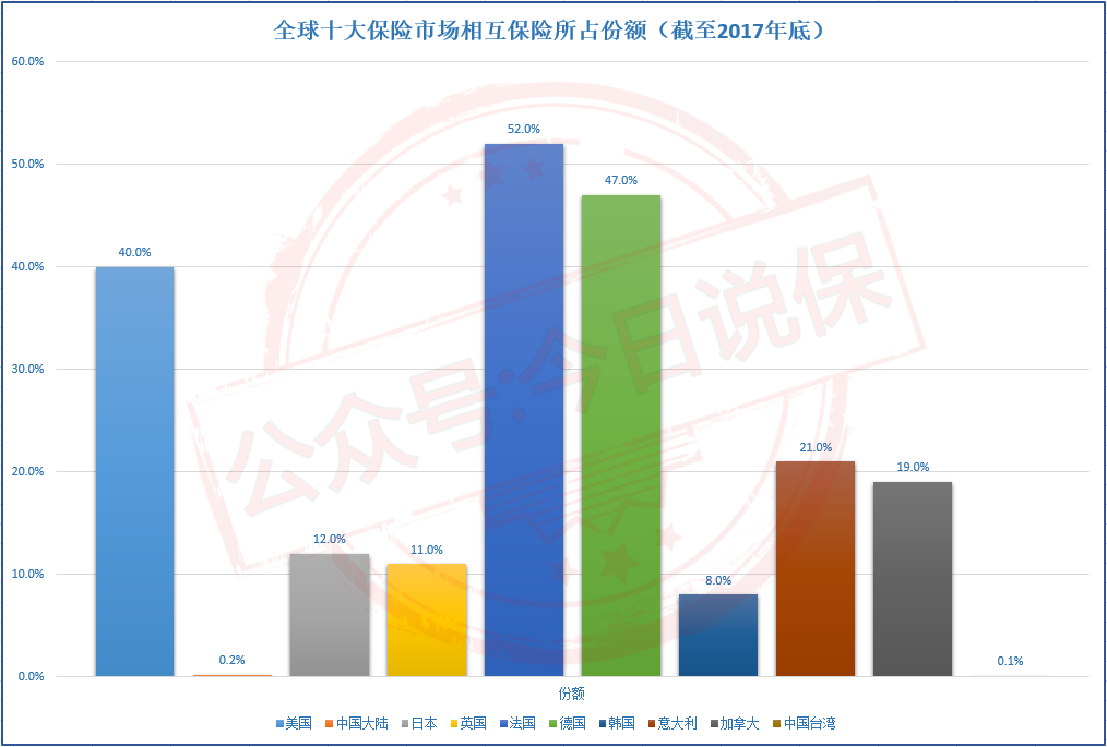截至2017年底,相互保险占全球保险市场的份额为26.7%,其中寿险业务占22.5%,非寿险业务占31.6%,共覆盖9.2亿人,但中国大陆相互保险的市场份额仅占0.2%。