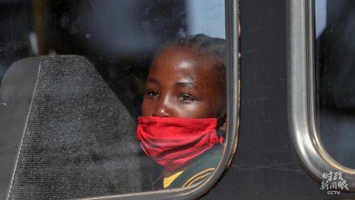 △南非约翰内斯堡,公交车里向外张望的女孩。