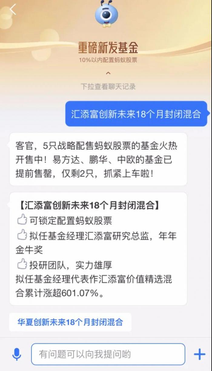 目前,在售的两只基金,蚂蚁财富主推了汇添富创新未来18个月封闭混合,还提示在假期期间正常认购。