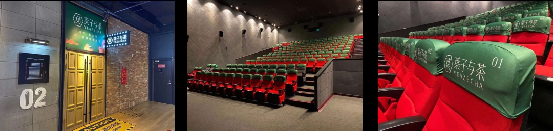 最近叶子与茶在无锡一家影院做了影厅冠名的广告投放,影厅引导牌、门头、座椅背套等区域都有品牌的露出。