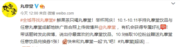 消费者想赢取专属好礼,要手持丸摩堂饮品,与丸摩堂任意地铁广告合照,上传微博并@丸摩堂。这波广告,自带传播属性,适合节日营销,而且参与感满满。