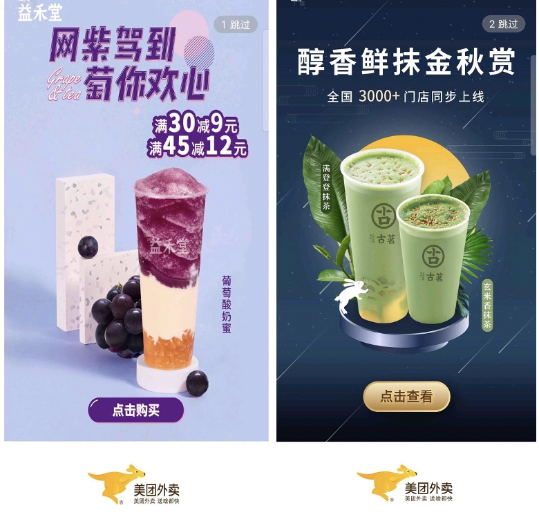 近期古茗、益禾堂都在美团APP的开屏页面做以广告投放,一般是按天来投放,不同城市投放价格也不同。