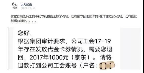 据中国基金报此前报道,9月30日,微信公众号“大力如山”称,某券商要求员工将多年前发放中秋福利退回。