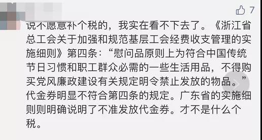 有网友称,《浙江省总工会关于加强和规范基层工会经费收支管理的实施细则》第四条:“慰问品原则上为符合中国传统节日习惯和职工群众必需的一些生活用品,不得购买党风廉政建设有关规定明令禁止发放的物品。”代金券明显不符合第四条的规定。