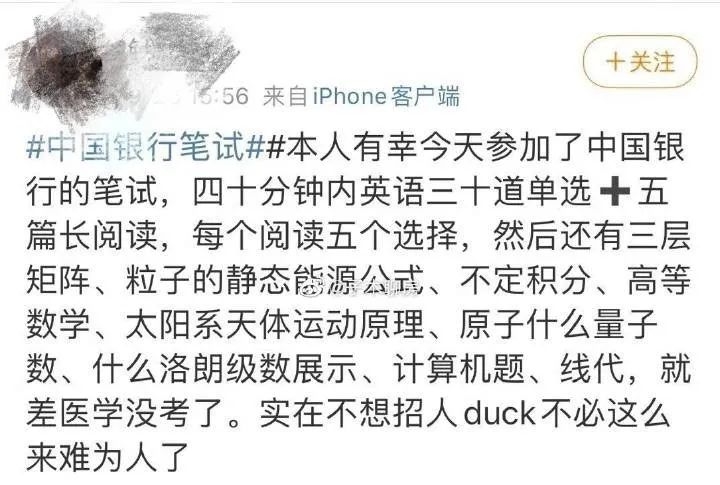 前段时间,中行和交行笔试连续登上热搜。网友透露:四十分钟内英语三十道单选、五篇长阅读,还有三层矩阵、粒子的静态能源公式、不定积分、高等数学、太阳系天体运动原理等等,并吐槽说大可不必这样难为人。