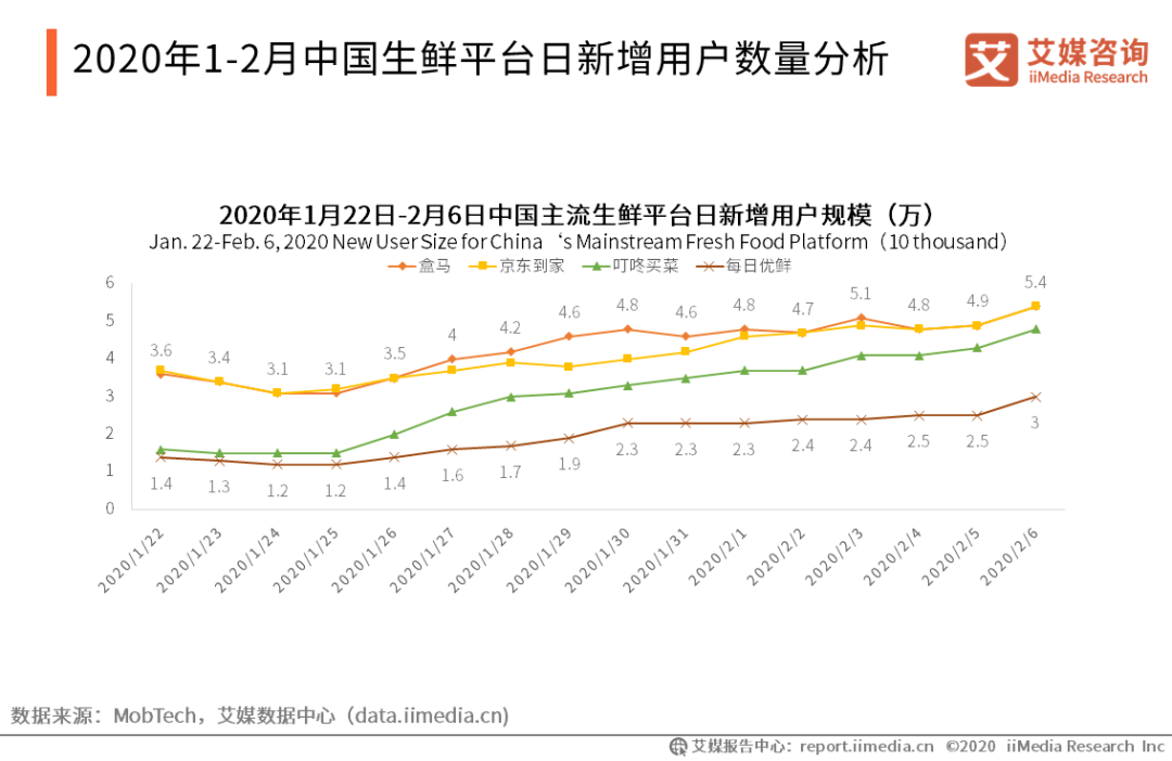 2019年,叮咚买菜已经建立超过345个线下服务站,单月营收达7亿,全年GMV突破50亿人民币。受益于强大的供应链能力和战法的成功,叮咚买菜在疫情中快速崛起,新增用户突破了4万,在2020年2月份已经逼近第一阵营,月营收超过12亿元。