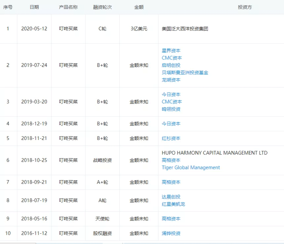 在叮咚小区改名一年后,叮当买菜开始受到资本市场信任,获得高榕资本领投的 pre-A 轮融资,而后仅 2018 年便拿到了 5 轮融,截止到目前,叮咚买菜已经累计10轮融资,成为了生鲜电商的资本宠儿。