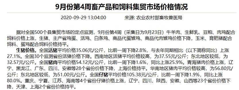 农业农村部最新统计数据显示,9月第四周全国活猪平均价格为35.06元/公斤,比前一周下降2.8%,与去年同期相比上涨27.1%,7周累计降了2.18元/公斤。同时,这周的全国猪肉平均价格为54.12元/公斤,比前一周下降1.6%,同比则上涨25.9%,4周累计下降1.97元/公斤。