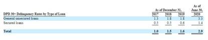 逾期率上升的主要原因是受到了疫情的影响,不过今年二季度单季度逾期率已下降到了去年同期的水平,并未受到疫情的持续影响。三季度信贷表现已从新冠肺炎疫情的冲击中基本恢复。截至2020年9月30日,一般无抵押贷款的30天以上逾期率下降至2.5%,有抵押贷款的30天以上逾期率下降至0.9%。