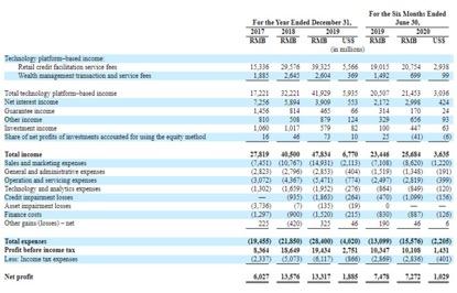 招股书显示,2019年陆金所控股实现营业收入478亿元,净利润133亿元, 2017至2019年净利润复合增长率达到近50%。 从收入结构来看,基于科技平台的收入成为陆金所控股营收主力,2020年上半年占比87.7%,这部分收入包括零售信贷交易促成服务费和理财交易服务费。