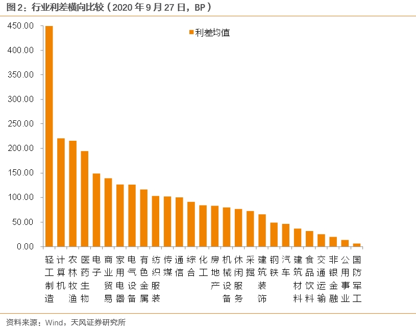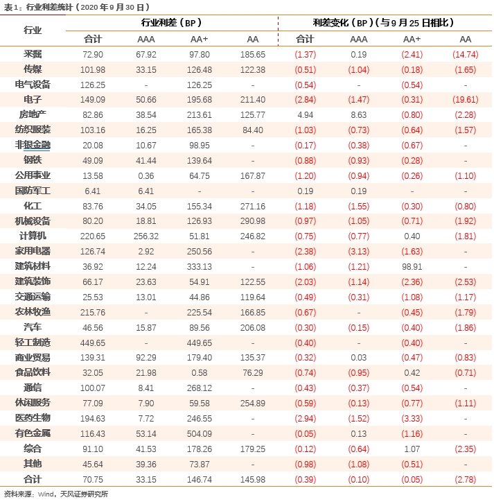 产业债利差整体下行。9月30日,产业债整体行业利差为70.75bp,与9月25日相比,下行0.39bp。分评级来看,AAA、AA+、AA级产业债整体利差分别为33.15bp、146.74bp、145.98bp,与9月25日相比,AAA、AA+、AA级分别下行0.10bp、0.05bp、2.78bp。分行业来看,利差最高的行业为轻工制造、计算机、农林牧渔、医药生物,行业利差分别为449.65bp、220.65bp、215.76bp、194.63bp。