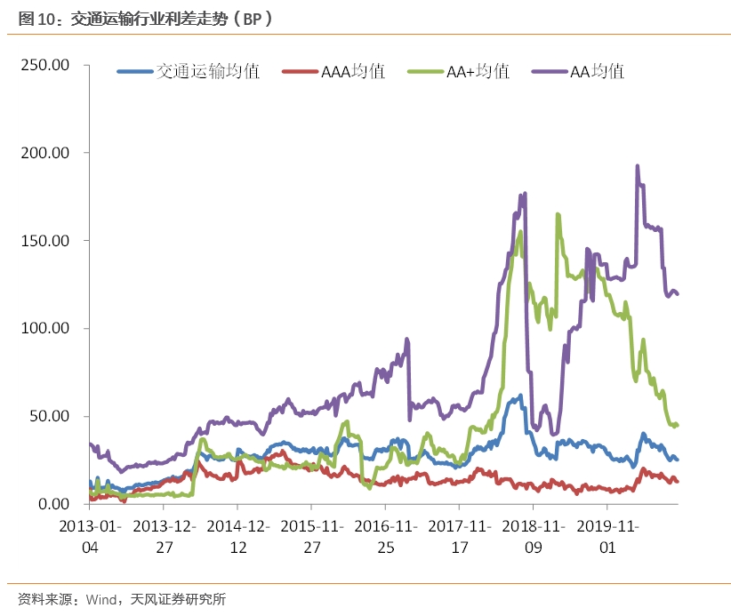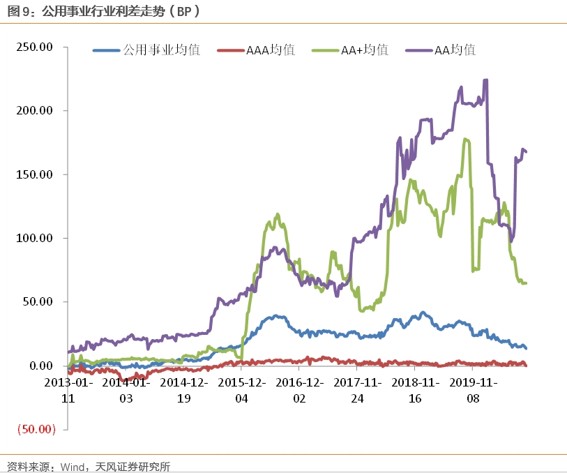 公用事业类产业债行业利差整体下行。9月30日,公用事业类产业债行业利差为13.58bp,与9月25日相比,下行1.20bp。分评级来看,AAA、AA+、AA级公用事业类产业债行业利差分别为0.36bp、64.75bp、167.87bp,与9月25日相比,AAA级产业利差下行0.94bp、0.26bp、1.10bp。
